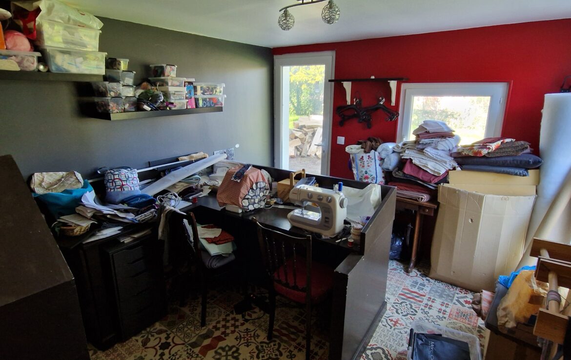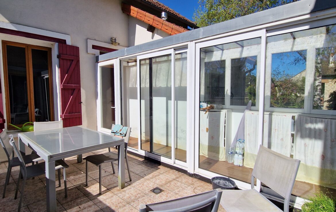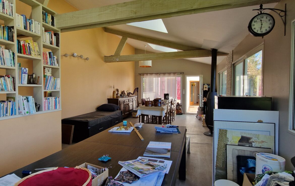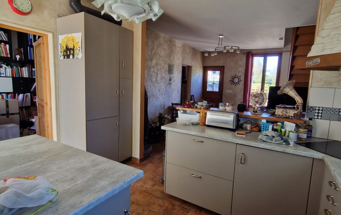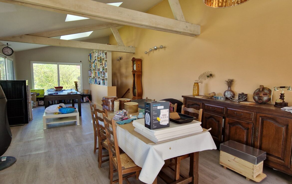 Maison ancienne de 149 m² habitables, édifiée sur sous-sol total composé de 3 pièces comprenant au rez-de-chaussée : entrée sur salon avec poêle à bois, deux chambres, salle de bains – toilettes, cuisine aménagée équipée ouverte, à la suite extension composée d’un couloir qui dessert une terrasse et le séjour double. En rez-de-jardin : atelier (chambre possible).
