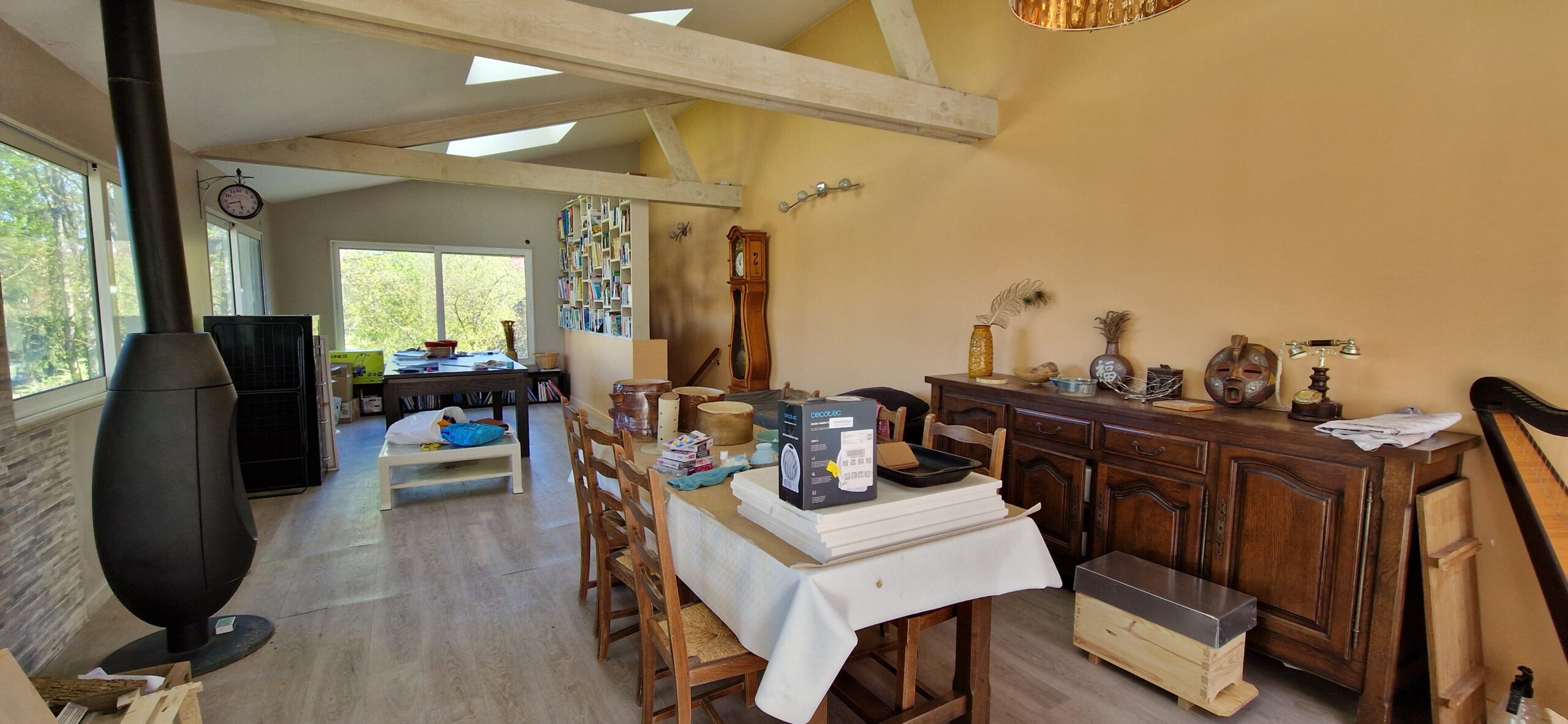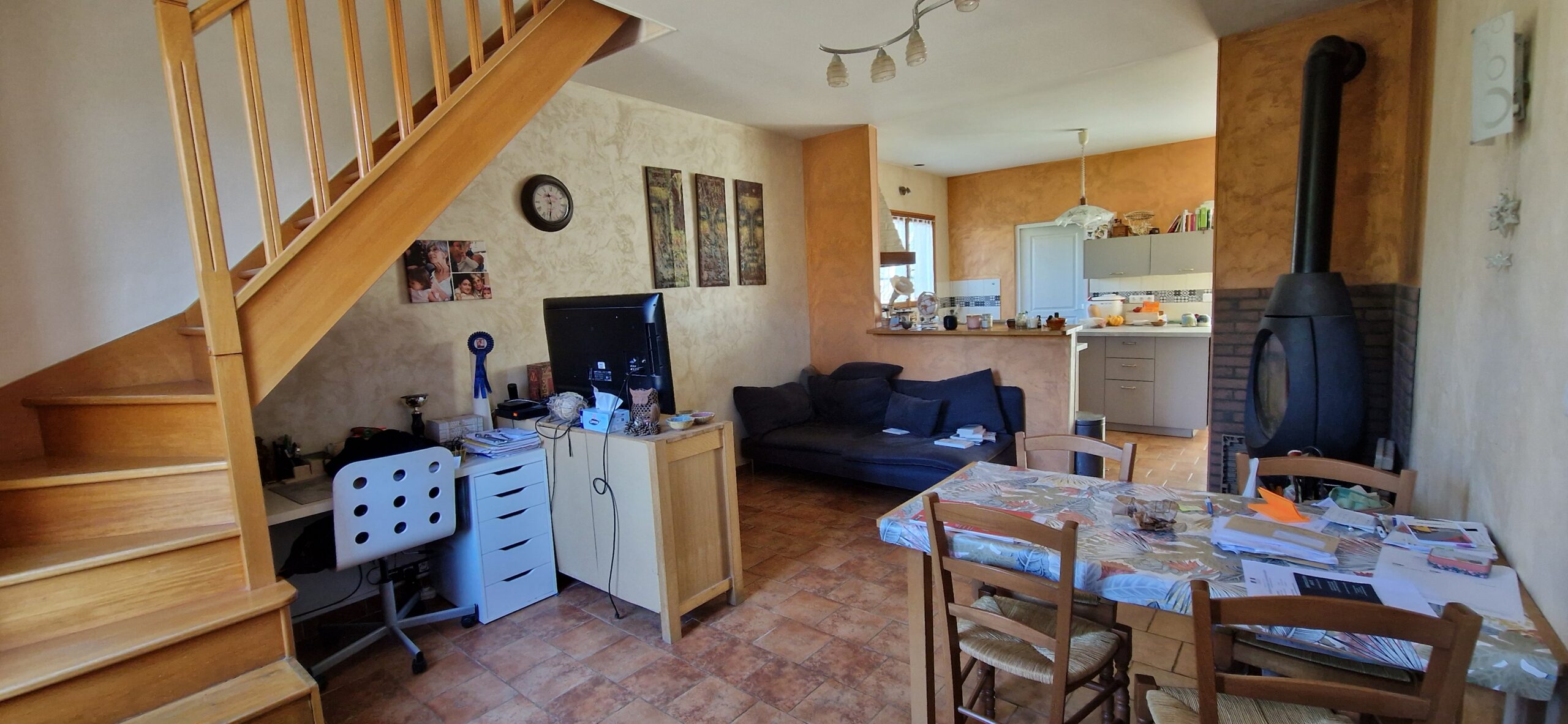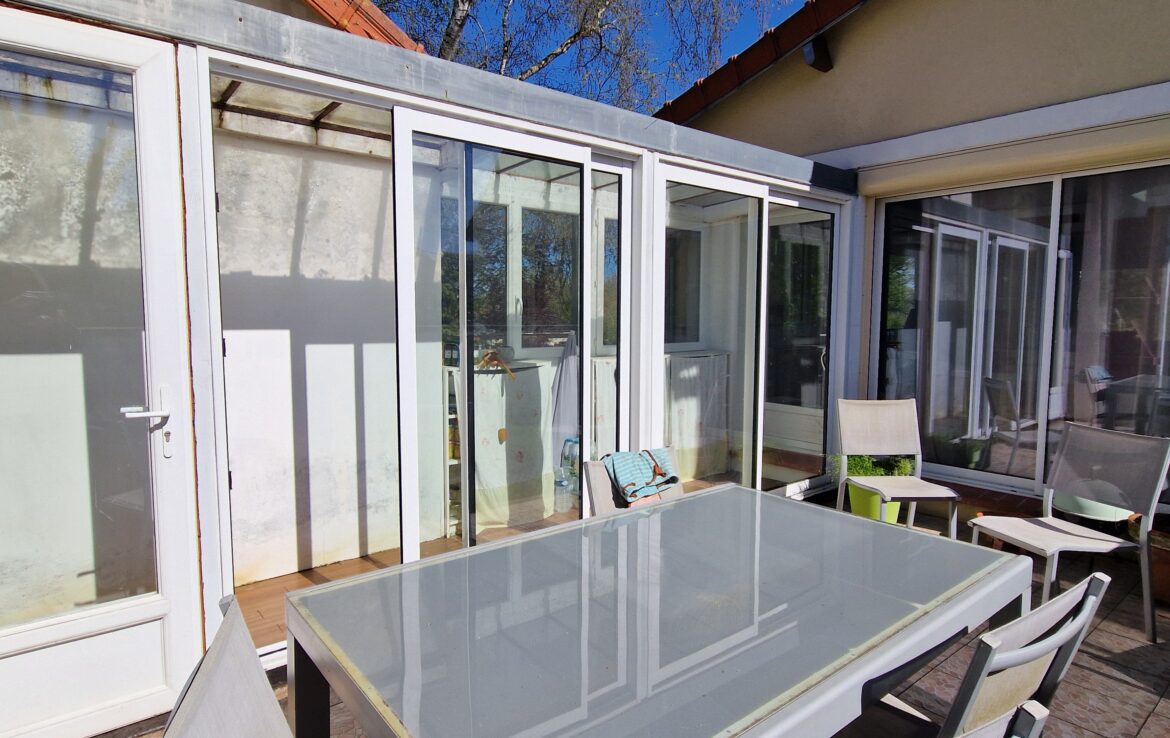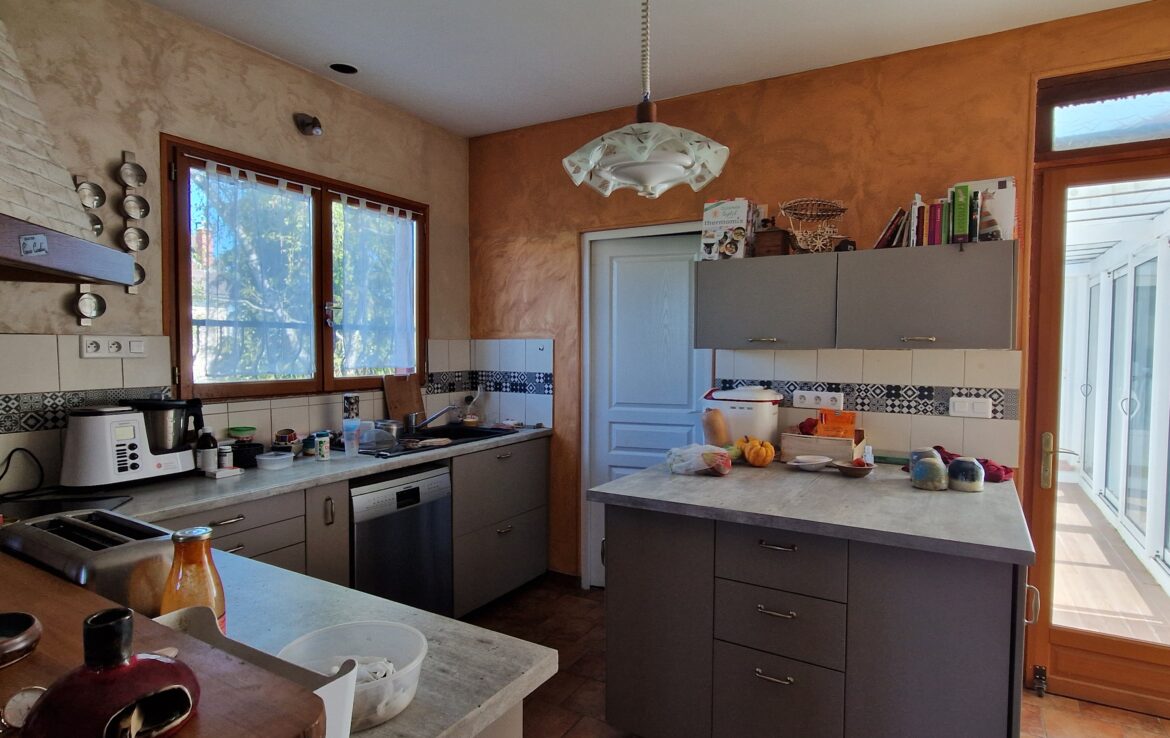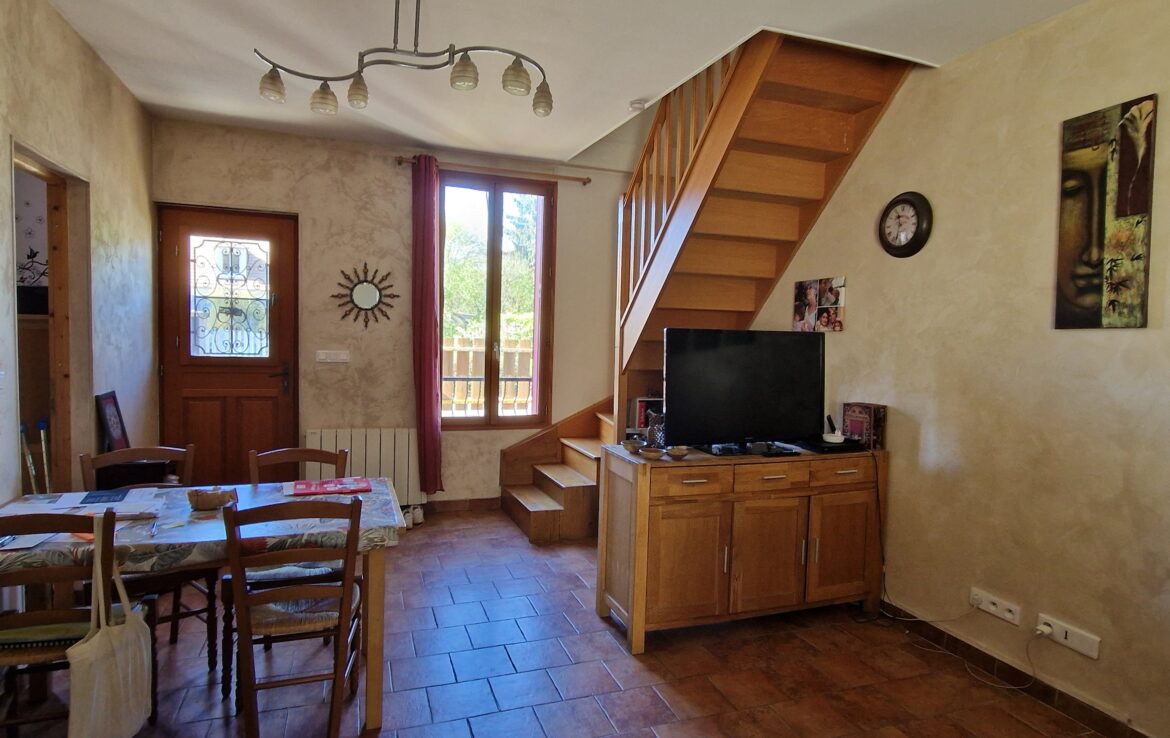 Maison ancienne de 149 m² habitables, édifiée sur sous-sol total composé de 3 pièces comprenant au rez-de-chaussée : entrée sur salon avec poêle à bois, deux chambres, salle de bains – toilettes, cuisine aménagée équipée ouverte, à la suite extension composée d’un couloir qui dessert une terrasse et le séjour double. En rez-de-jardin : atelier (chambre possible).